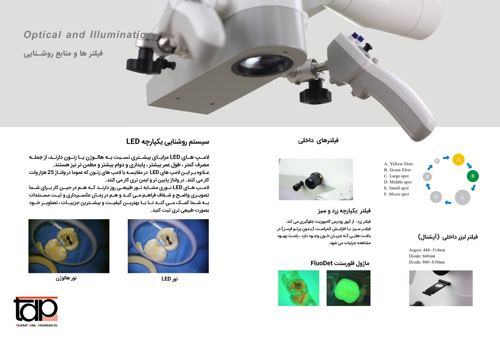 فیلترهای ایزری قابل تعویض (آپشنال) : فیلتر لیزر 40 LF (488-514 نانومتر)، فیلتر لیزر 60 LF (nm660 )، فیلتر لیزر 80LF (800-830 نانومتر) |